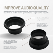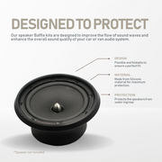 Hannað til að passa á alla 165 mm hátalara, þetta par af stillanlegum hátalaraskífum skapar sveigjanlega innsigli í kringum bakhlið hátalaranna, sem verndar þá fyrir vatni sem kemst inn í hurðir. Að auki veitir það hindrun sem stöðvar truflun á milli hljóðs að framan og aftan á hátalarunum